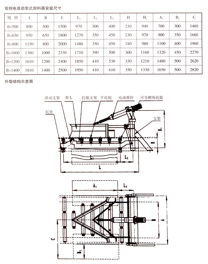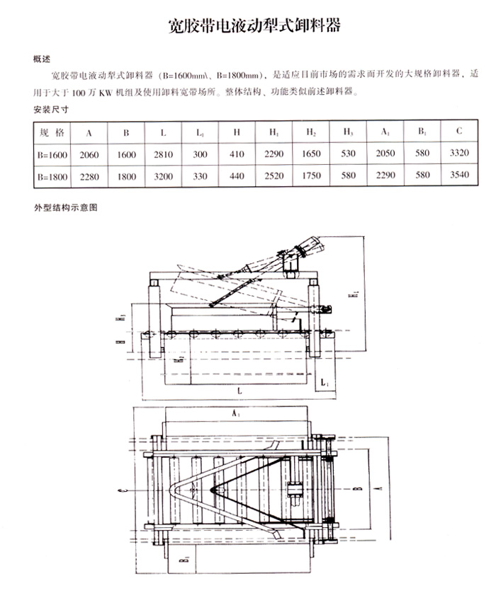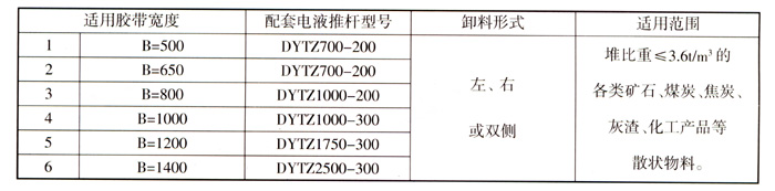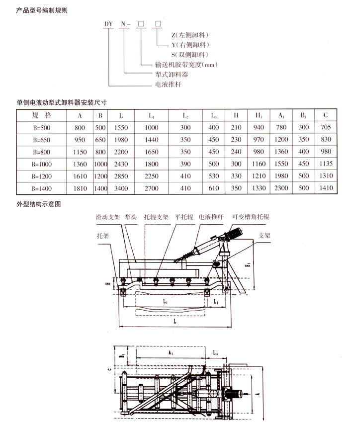 | 技術(shù)資料 Technology material |  電液動犁式卸料器 概述   DYN-IV型電液動犁式卸料器,是我公司和電力部中南電力設(shè)計院聯(lián)合開發(fā)的產(chǎn)品之一,是安裝在膠帶輸送機上執(zhí)行卸料及控制物料輸送流量、流向的機械配套產(chǎn)品,可直接安裝在膠帶輸送機的中間架上,能將膠帶輸送的物料在中途均勻、連續(xù)地卸入漏斗(料斗)中,或卸到需要的場所去。   該產(chǎn)品進一步完善了原ZNX型卸料器的不足之處,由于改用了雙犁頭、犁頭鎖緊裝置和新型的電液推桿,克服了卸料器犁料不盡、刮皮帶以及電動推桿過載能力差、常燒毀電機、頂彎絲桿、機械易損壞等缺點,為目前國內(nèi)先進的一種卸料器。本機設(shè)計合理,損傷維修簡便,可就近或遠距離控制,廣泛應(yīng)用于電力、冶金、煤炭、化工、建材和港口碼頭等輸送行業(yè)中。 工作原理   電液動犁式卸料器以電液推桿為動力源,工作時,通過推桿伸出作用于驅(qū)動桿、帶動框架前進,完成犁刀下落,并支承起平托輥組,使膠帶工作面平直,犁刀下沿與膠帶面貼合緊密,將運行膠帶上物料卸入漏斗(料斗)中,或卸到需要的場所去。卸料完畢時,啟動推桿縮回作用于驅(qū)動桿,帶動框架后退、犁刀上抬、可變槽角托輥組由平形變回槽形,使膠帶工作面恢復(fù)槽形狀態(tài),讓物料平穩(wěn)通過。   由于電液推桿采用液壓傳動,具有自動過載保護性能,當(dāng)運行受阻時,油路壓力增高到調(diào)定的限額,溢流裝置迅速而準確地溢流,實行過載保護。電機運轉(zhuǎn)在額定值內(nèi),不會燒毀。   電液推桿油路集成塊中設(shè)計了自鎖機構(gòu)、電機停止、活塞桿能自鎖在一定的位置上,處于保壓狀態(tài)(電液推桿性能詳情參閱使用說明書)。 結(jié)構(gòu)特點   1、電液推桿采用機、電、液一體化,動作靈敏,運行平穩(wěn),行程控制準確,工作油路循環(huán)于無壓密閉的鋼筒里,在惡劣的工作環(huán)境下,不吸塵、不進水、不漏油,使用壽命比氣缸和電動推桿長久。   2、根據(jù)多種不同的使用行業(yè)、場所,設(shè)計了多種外形尺寸的電液推桿,其安裝尺寸可直接取代氣缸和電動推桿。   3、采用可變槽角托輥組,根據(jù)工作狀態(tài)自動變動平形或槽形狀態(tài),有效地防止了撒料。   4、選用新材質(zhì)犁刀,耐磨無鋒口,不易損壞膠帶,延長了輸送膠帶的使用壽命。   5、設(shè)計的犁頭鎖緊裝置,工作時犁刀不會因物料的沖擊力而抬起或抖動,犁刀下沿與膠帶面貼合緊密,無漏料現(xiàn)象,操作維修簡便,可就近或遠距離儀器集中控制。 型號規(guī)格技術(shù)參數(shù)